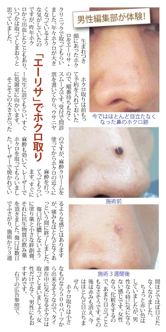 多くの人には必ずほくろがあ ります。たくさんある人も珍しくありません。ほくろは、多くの人では小児期から思春期にかけて増えてきますが、中には一生増え続ける人もいます。女性の場合、 ホルモン量の変化に対応して変化します。妊娠中はほくろができる、大きくなる、色が濃くなるなどの変化がみられます。一度できたほくろは自然には消え ません。皮膚の色が薄い人では、主に日光にさらされる部分にできます。患部表面が乾き、1~2日で膜(カサブタ)が張りましたらお化粧でカバーして頂けます。それほど目立つ状態ではありませんが、治療した部分は少し赤味がありますので、お化粧をされていない場合は、周囲の方も気付くかもしれません。